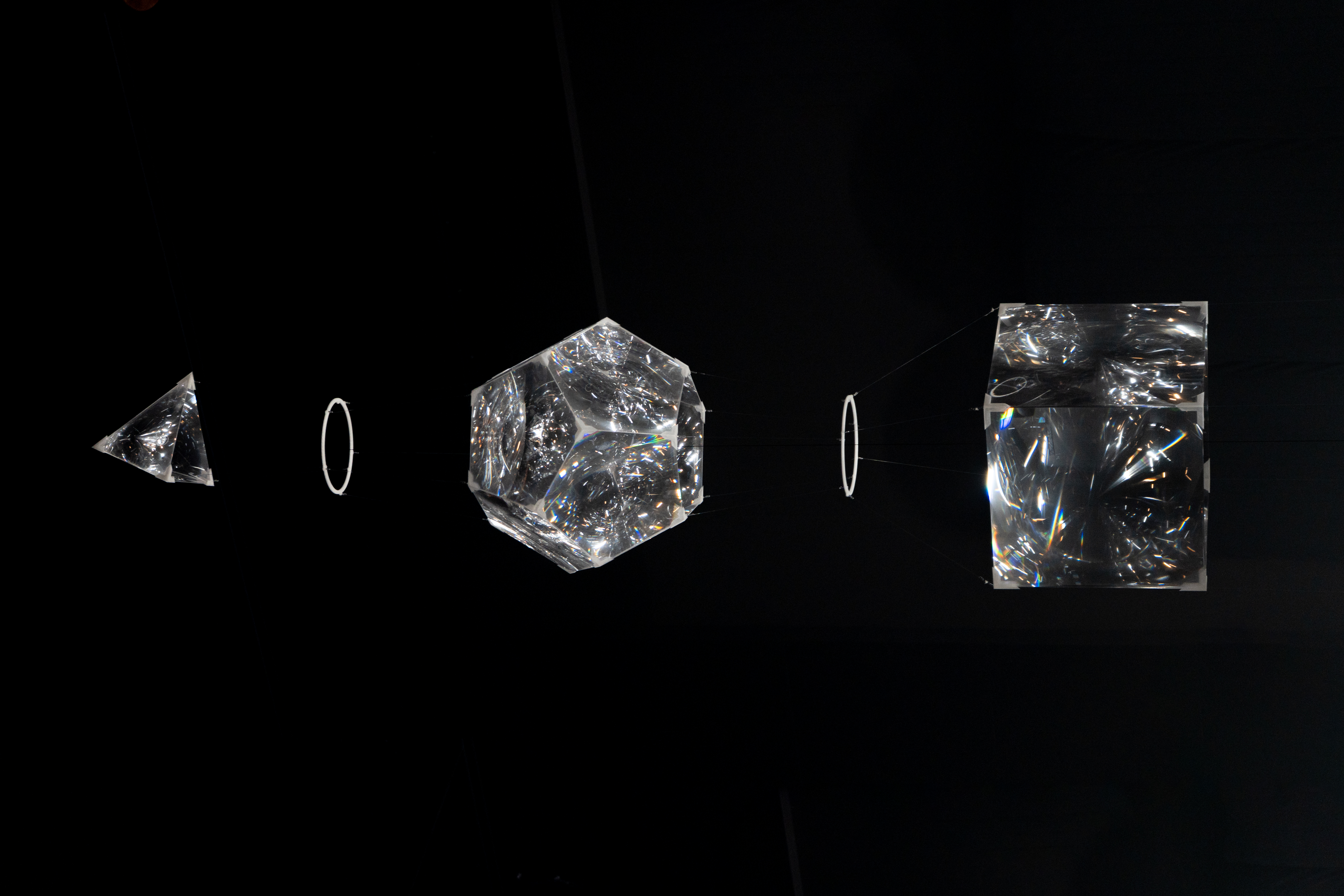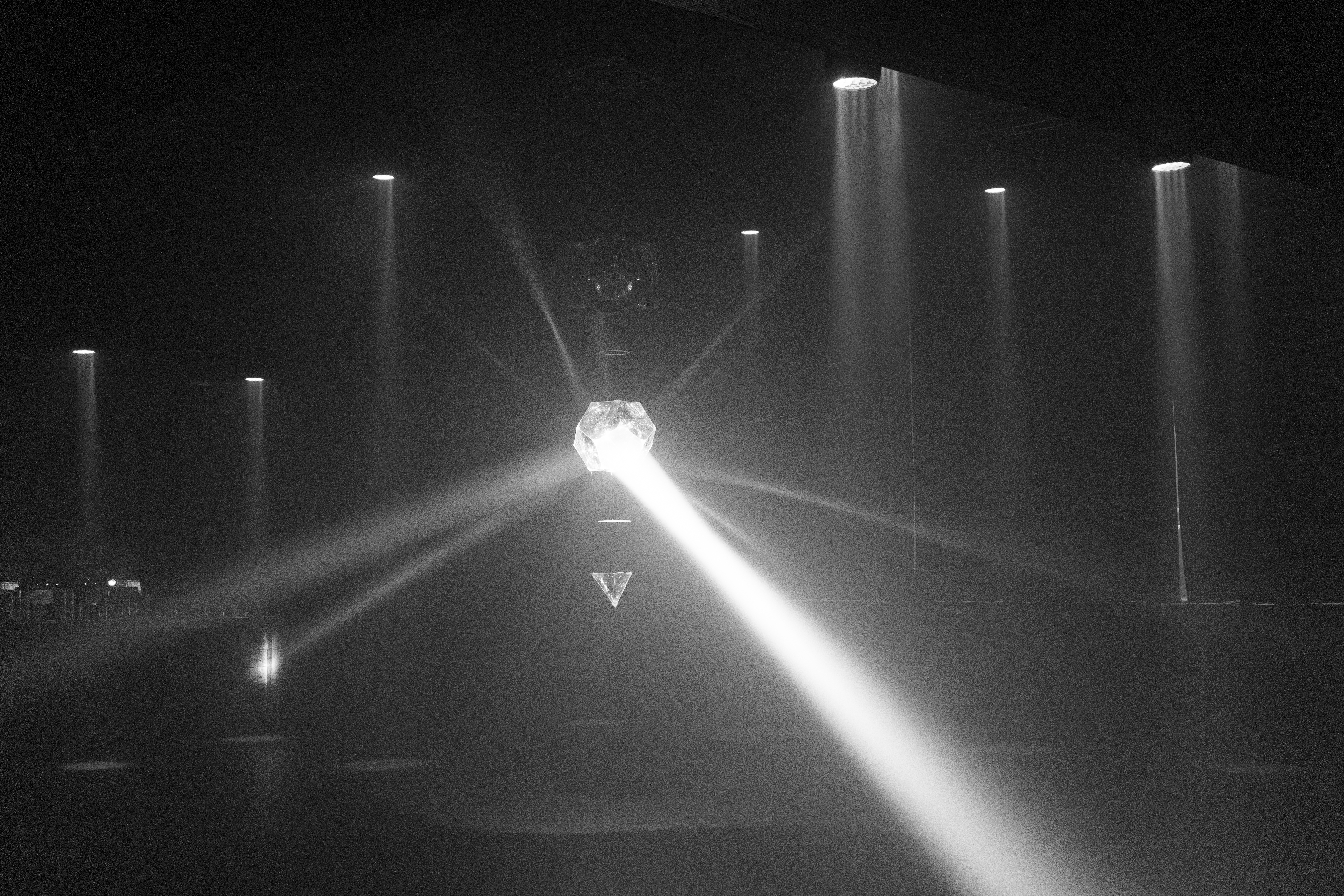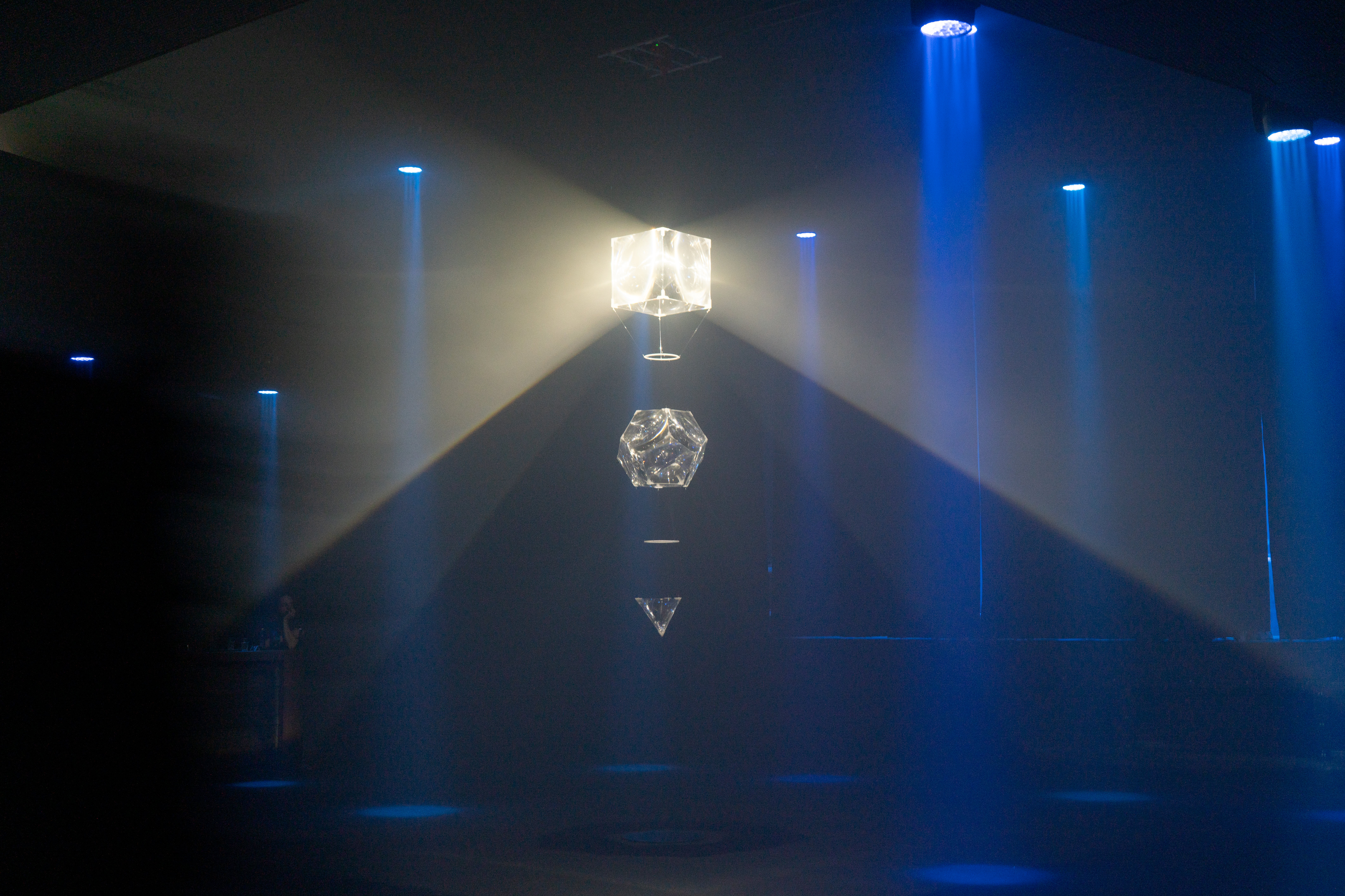 In Forms of Refraction, I transform light into a spatial and physical experience. Three platonic solid structures, a dodecahedron, a cube and a tetrahedron, are constructed from optical lenses and suspended in space. A single moving light travels through them, refracting into shifting focal points that become visible in the haze.